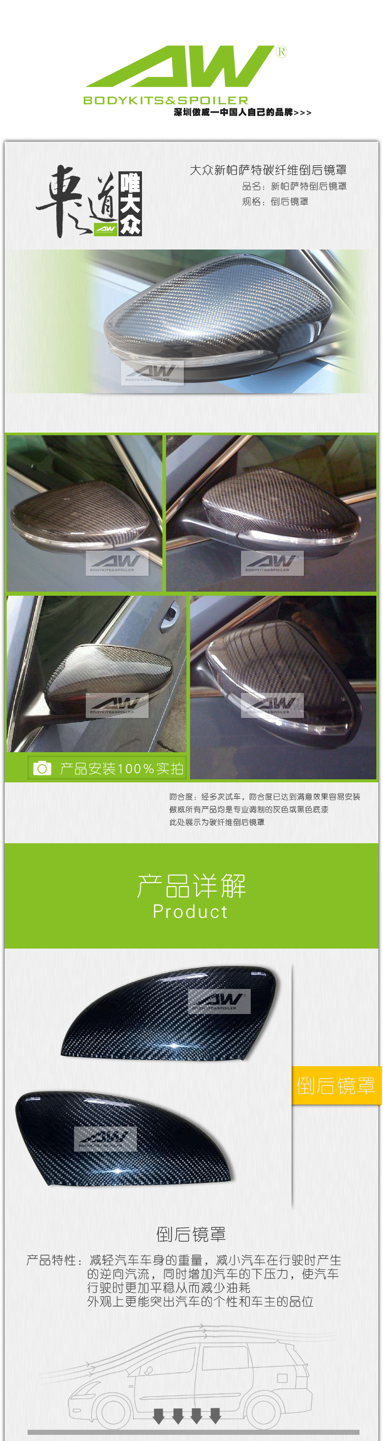 大众新帕萨特汽车改装件 碳纤维倒后镜罩免拆免打孔