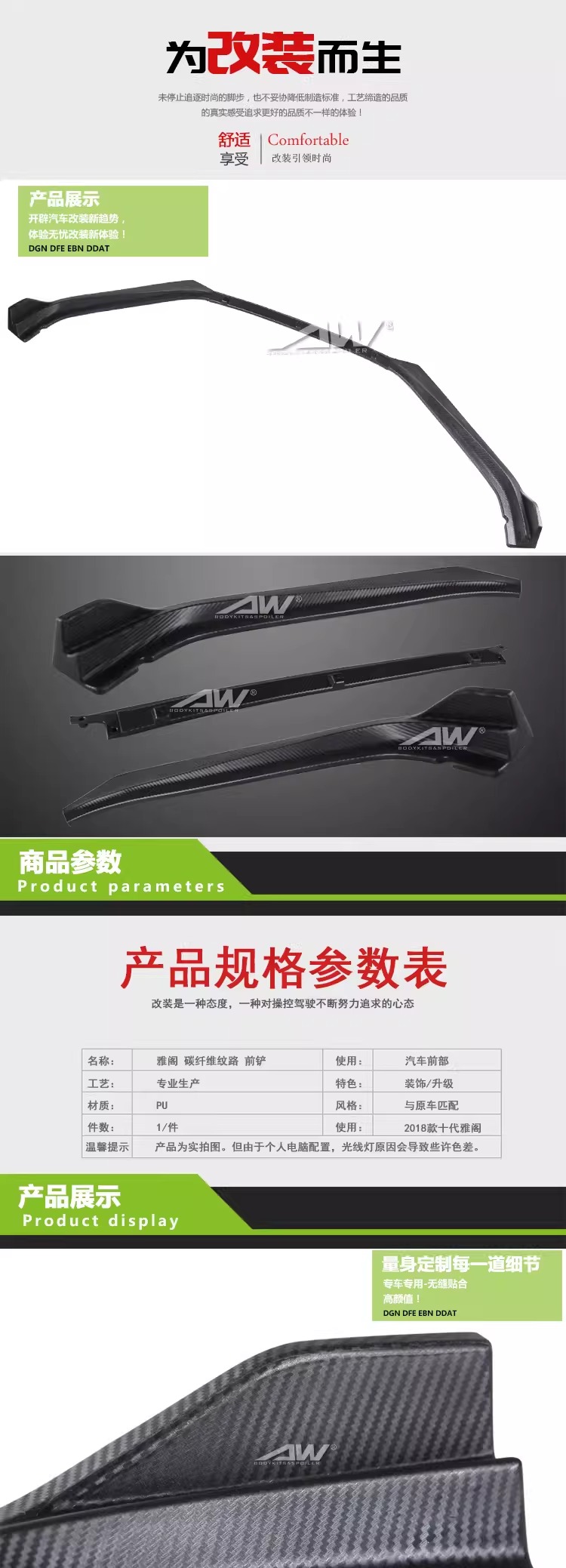本田18款雅阁十代改装前铲前唇前小包围碳纤维纹路前下巴PU材质