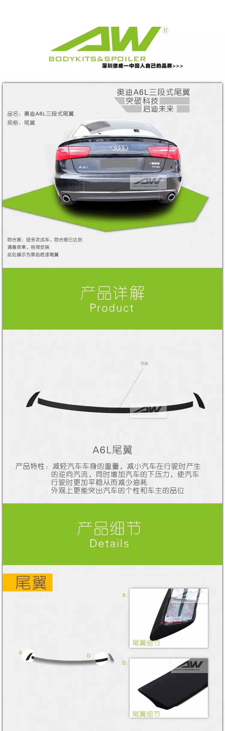 奥迪A6L改装三片式PU尾翼 AW Car Modified Three-part Rear Wing For Aud